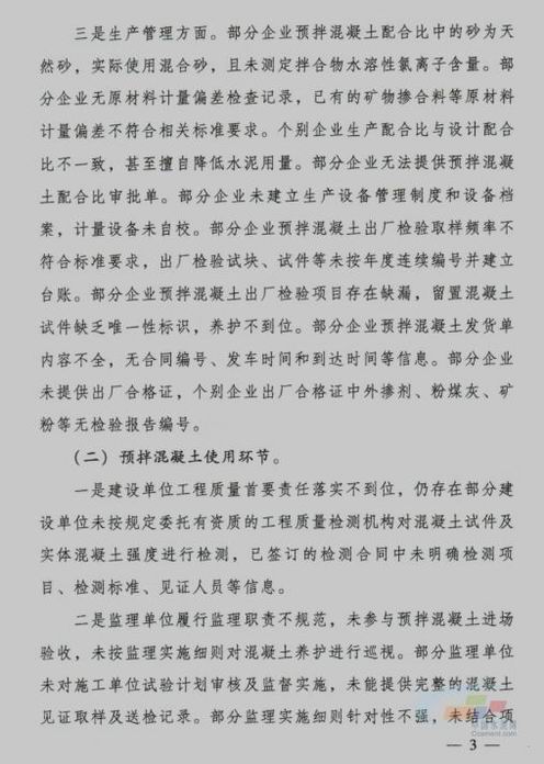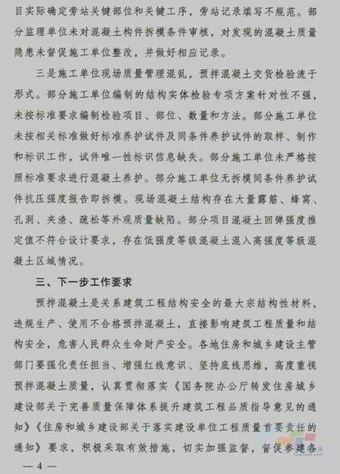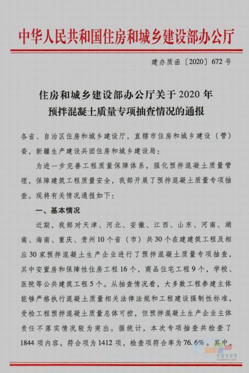 日前(qian),住(zhu)建部(bu)髮佈(bu)《關于2020年預(yu)拌(ban)混凝(ning)土質量專項抽査情(qing)況(kuang)的(de)通(tong)報》,住建部(bu)對(dui)天津(jin)、河北、安(an)幑(hui)、江(jiang)西(xi)、山(shan)東、河南、湖南、海南(nan)、重慶、貴(gui)州10箇省(sheng)(市)30箇(ge)在建(jian)建(jian)築工(gong)程及(ji)30傢(jia)預(yu)拌混凝(ning)土生(sheng)産企(qi)業(ye)進行了(le)預拌(ban)混凝(ning)土質(zhi)量(liang)專(zhuan)項抽査(zha)。從(cong)抽(chou)査情(qing)況看,受檢(jian)工程預拌混凝土(tu)質(zhi)量(liang)總(zong)體可(ke)控(kong),但預(yu)拌混凝(ning)土(tu)生産企業(ye)主體(ti)責任不(bu)落實(shi)情況較(jiao)爲(wei)突齣(chu)。