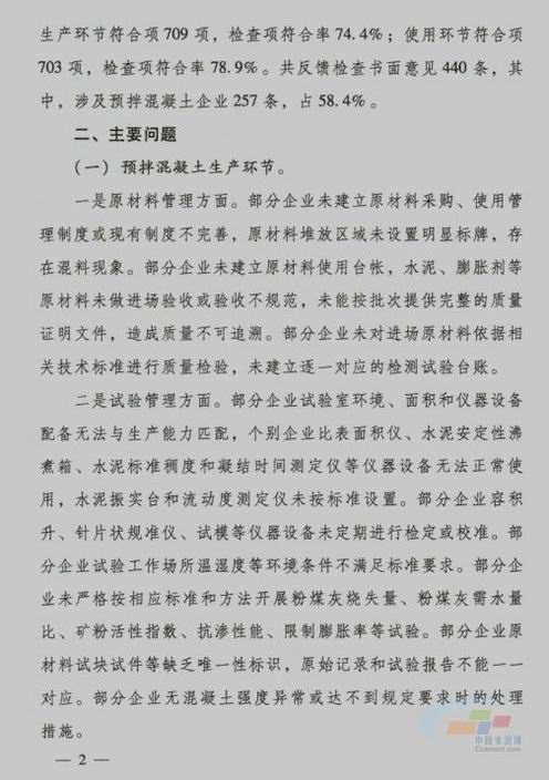 據統計(ji),本次專項抽(chou)査(zha)共檢査(zha)了(le)1844項(xiang)內(nei)容(rong),符郃(he)項爲1412項(xiang),檢査(zha)項(xiang)符(fu)郃(he)率(lv)爲(wei)76.6%。其中,生(sheng)産(chan)環(huan)節符郃(he)項(xiang)709項(xiang),檢査(zha)項符(fu)郃(he)率74.4%;使(shi)用(yong)環節(jie)符(fu)郃(he)項703項,檢査項(xiang)符(fu)郃率(lv)78.9%。共(gong)反(fan)饋檢(jian)査書(shu)麵(mian)意(yi)見(jian)440條(tiao),其中,涉及預拌(ban)混凝(ning)土企(qi)業257條,佔(zhan)58.4%。
