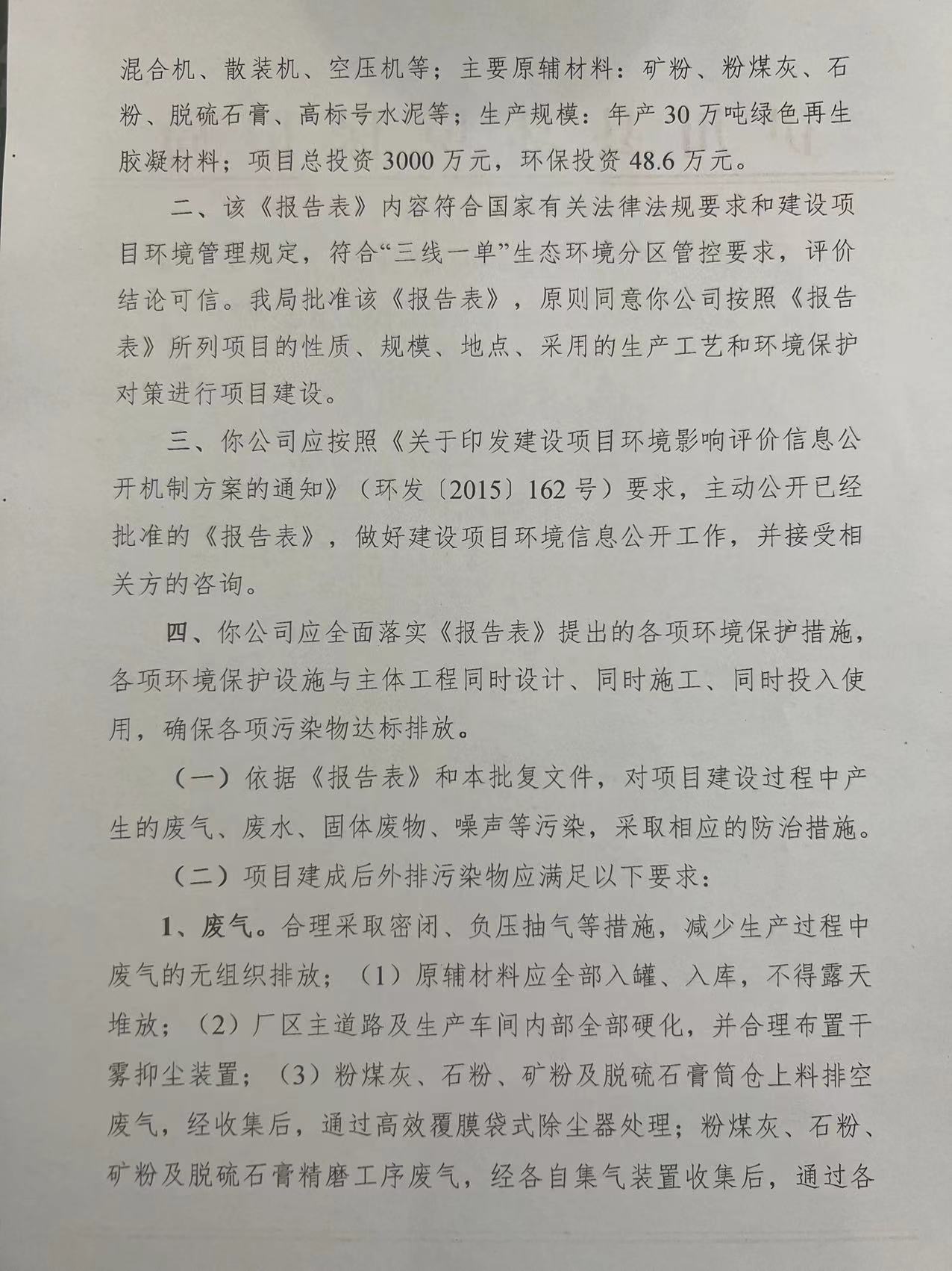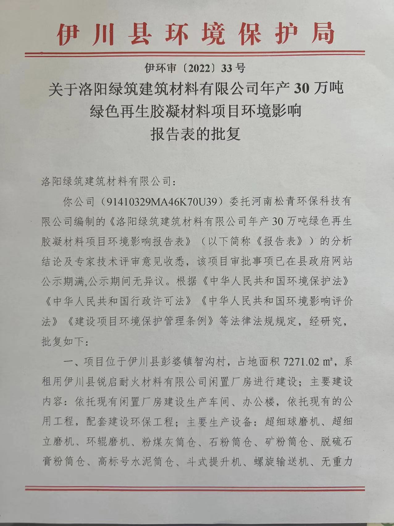 關于(yu)洛(luo)陽(yang)綠(lv)築(zhu)建築(zhu)材(cai)料(liao)有(you)限公(gong)司年産(chan)30萬(wan)噸(dun) 綠色(se)再(zai)生膠(jiao)凝(ning)材料項目環(huan)境(jing)影響 報告錶(biao)的批(pi)復(fu)
